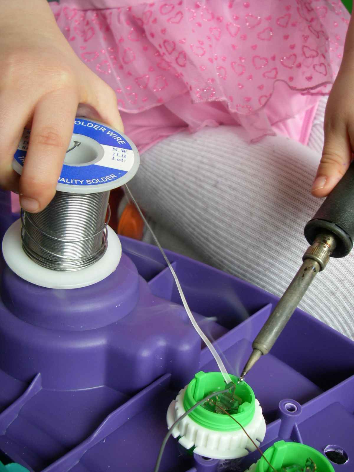 Demonstrating proper soldering technique: Hold the iron on one side of the work and the solder on the other,