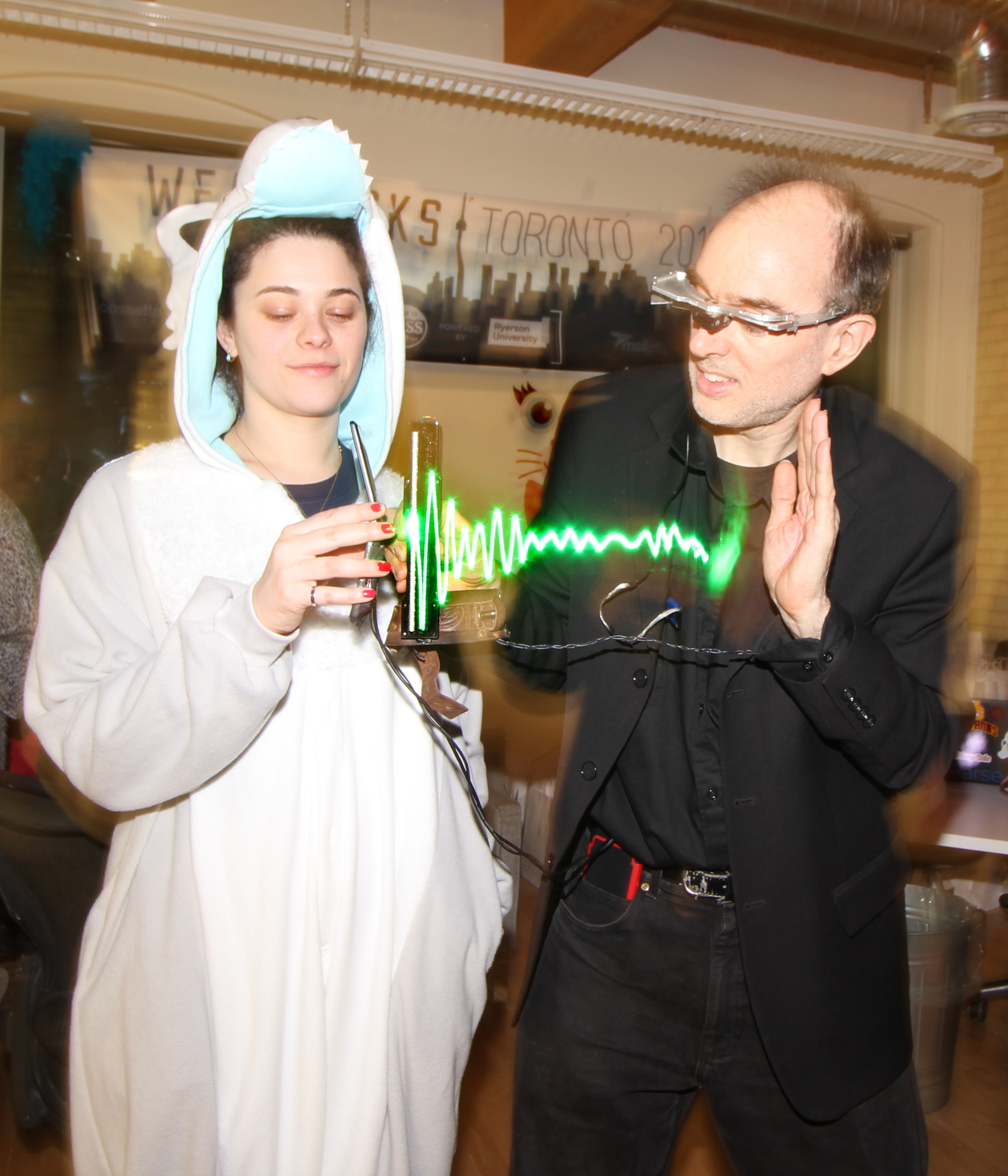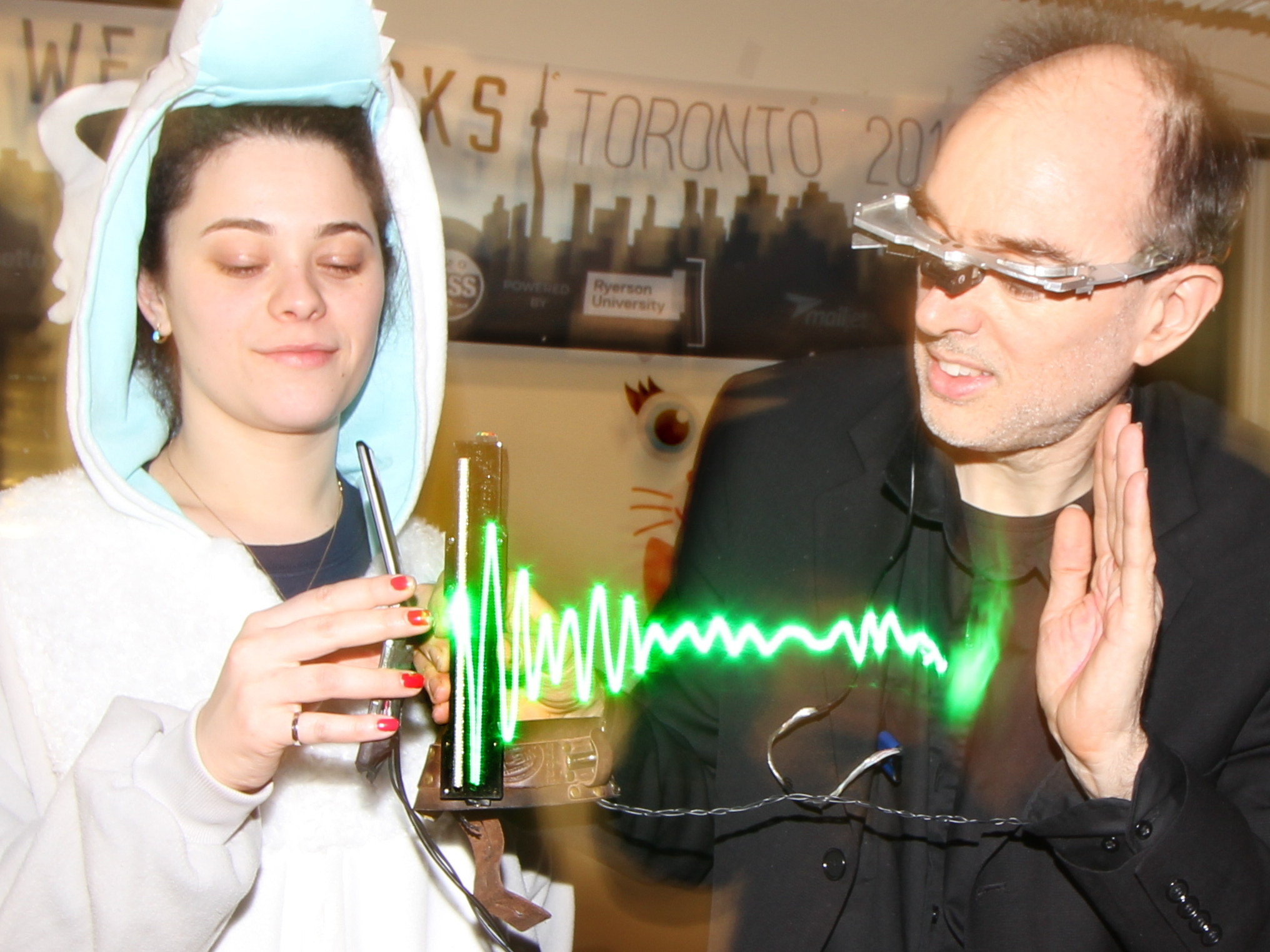 Among many live demos was the S.W.I.M. (Sequential Wave Imprinting Machine) wearable computing and augmented reality system Mann originally built at the age of 12, back in 1974, to measure the speed of light and the speed of sound, and, more importantly, to express radio waves in a coordinate system that moves at the speed of light, with the waves, so as to make them appear to sit still (or at the speed of sound for sound waves), as Phenomenological AR (Augmented Reality) overlays.