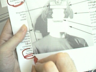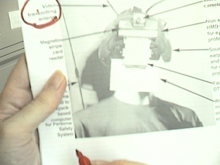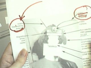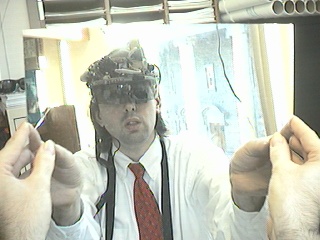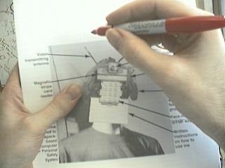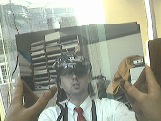 One computer goes to the big screen projector and runs a Web broswer that's pointed to my right eye (e.g. visits my EyeTap site). A second computer runs sfspeaker (SpeakFreely) and is connected to the PA system, and is responsive to the microphone array of my apparatus. A third computer runs sfmike and is set up so that I can hear the audience, their reactions to my lecture, and such. The third system sends the sound back to me, so that I can get audience feedback without acoustic feedback (e.g. I can hear the audience without getting the screech or squealing sound of positive feedback run amok).