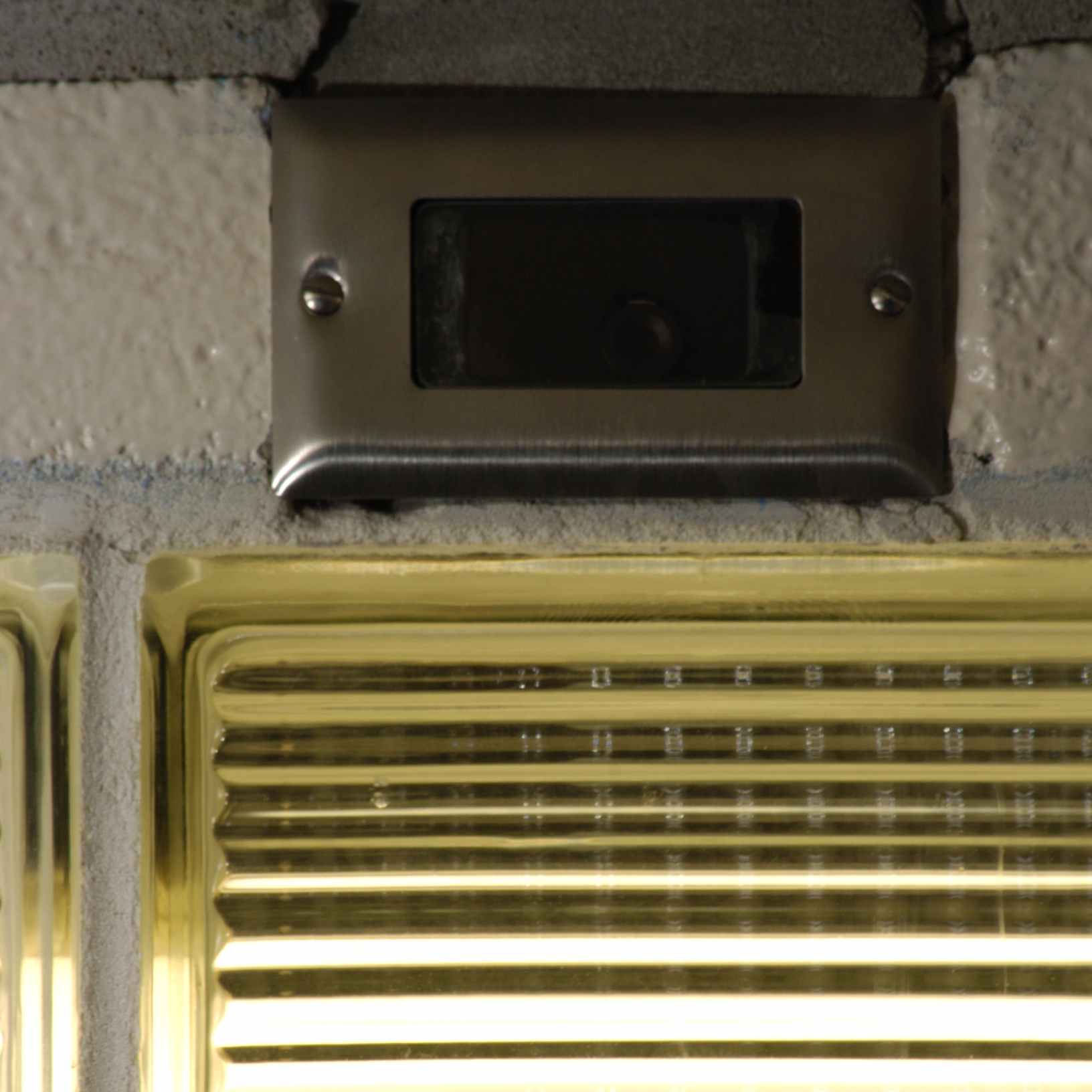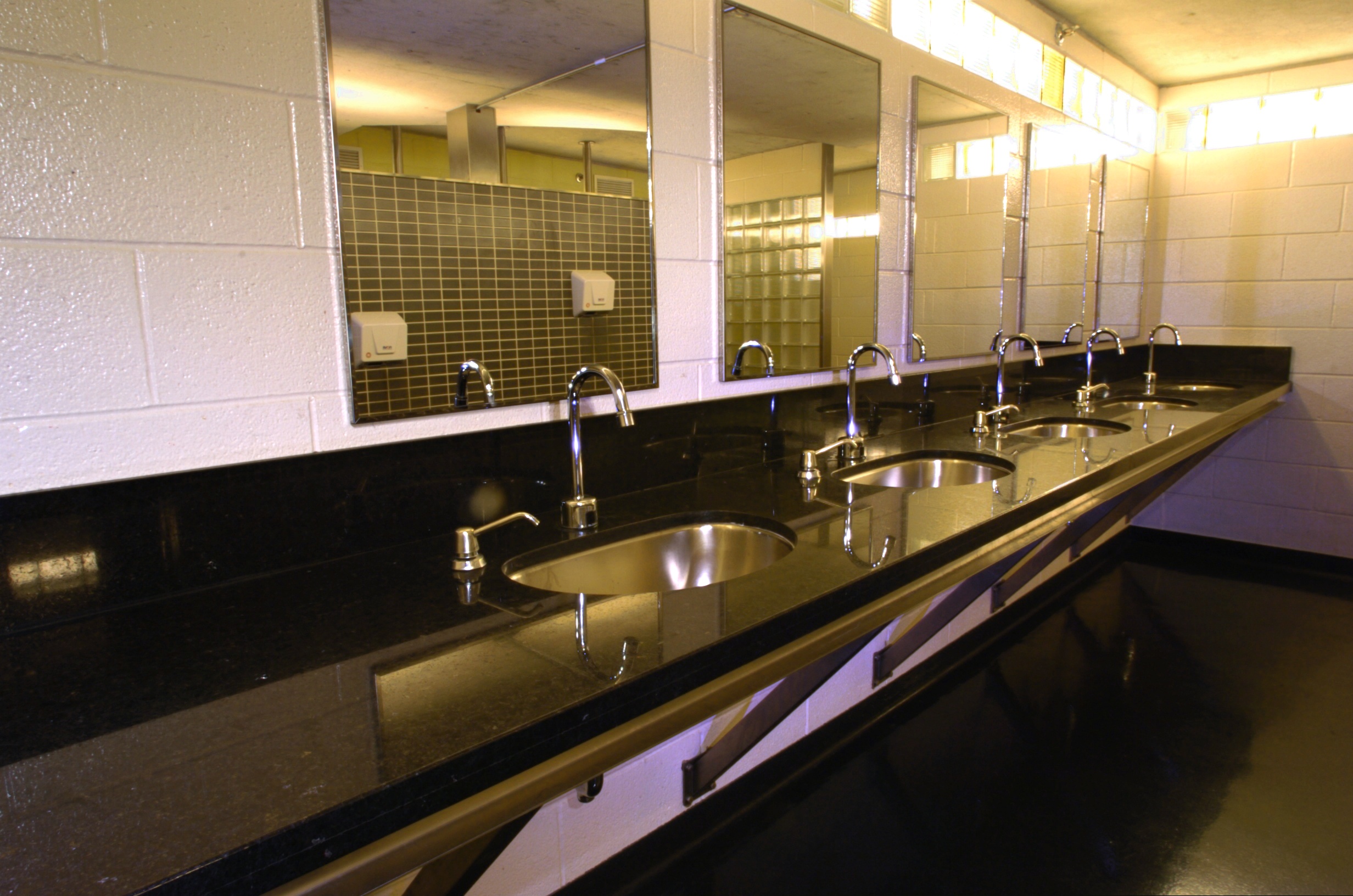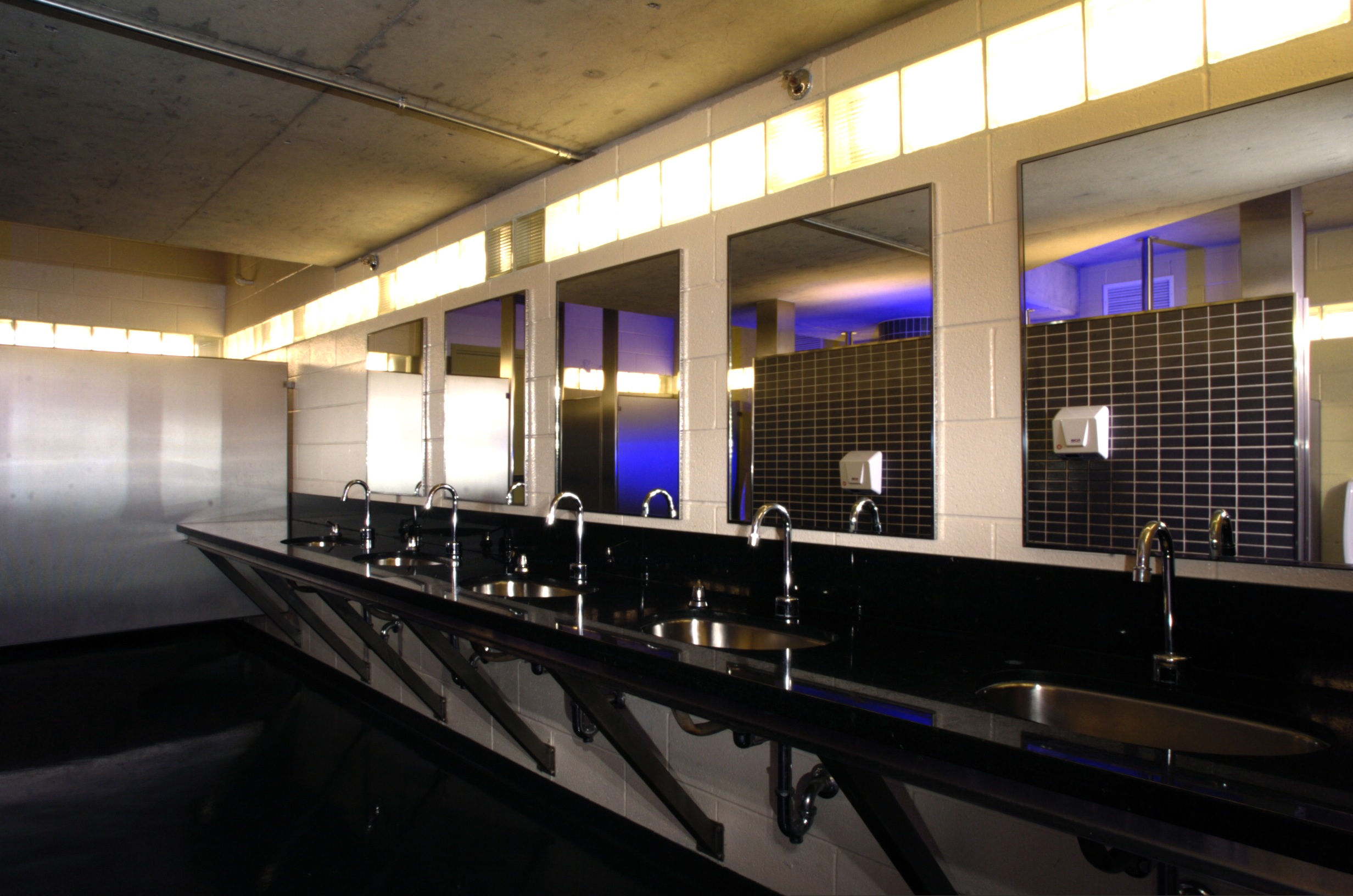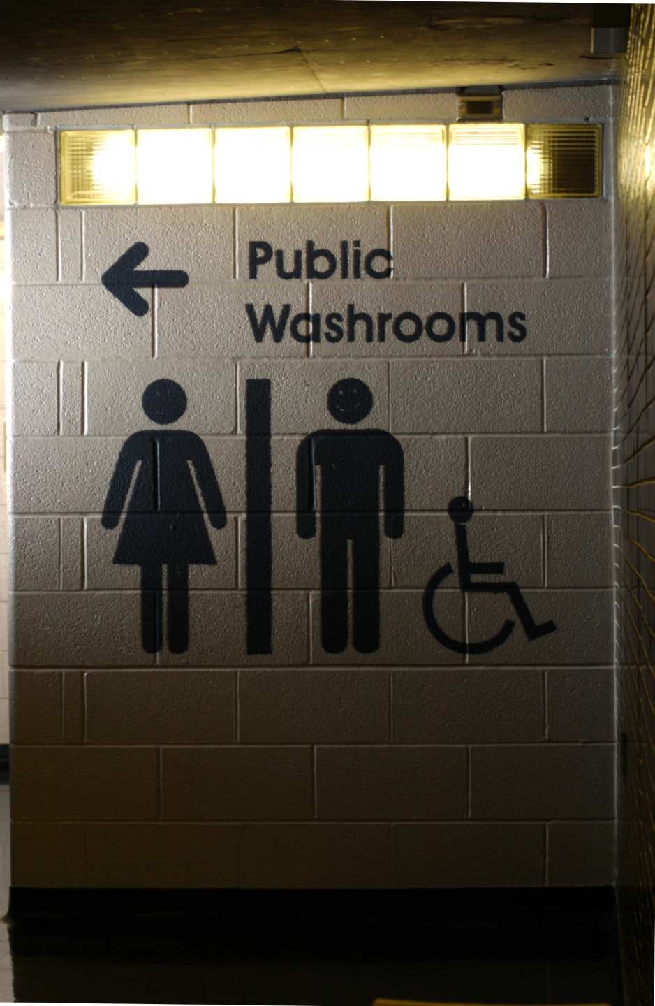 Windows all the way around the outside of the washrooms have lights behind them, to create the illusion of extensive natural light, even though the washrooms are underground. The windows are made of glass brick, permanently cemented in place. Lighting is installed in service tunnels that run around the outside of the washrooms. This provides optimum safety from electrical shock (keeping the lights outside the washrooms), hygiene (no cracks or openings), security (no way for vandals to access the light bulbs), and aesthetics (clean architectural lines that maintain a continuity of the raw industrial urban aesthetic).